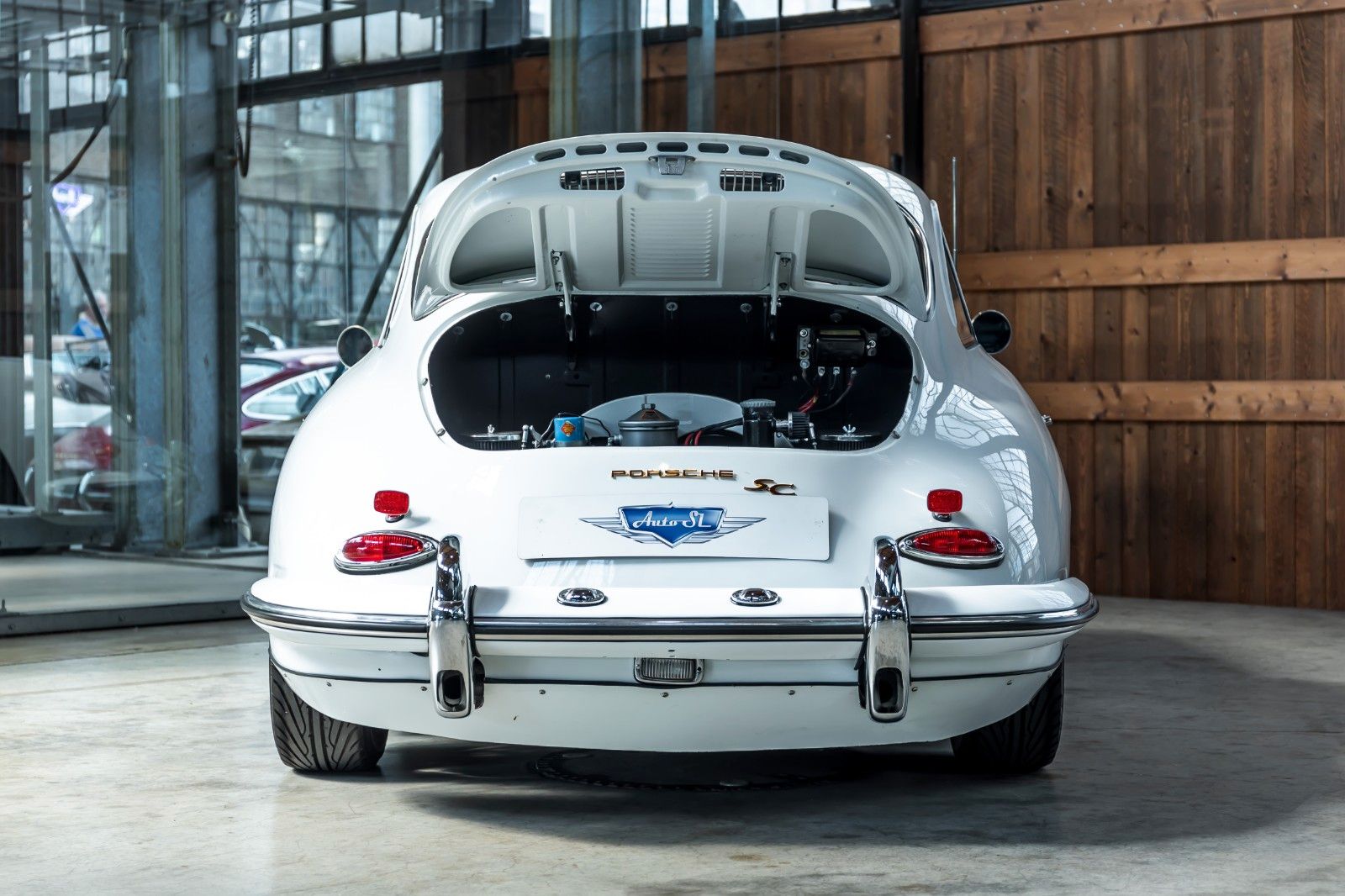 Wir präsentiren den Porsche 356 B S Coupé - Der Porsche 356 C ist äußerlich vom 356 B T6 kaum zu unterscheiden. Auffallend sind die geänderten Räder mit schlichteren Radkappen zunächst ohne Porschewappen. Bedingt ist die Änderung der Radschüsseln dadurch, dass Porsche jetzt alle Serienfahrzeuge mit Scheibenbremsen ausstattete (Ate-Bremsen nach Dunlop-Lizenz). Die hintere Ausgleichsfeder wurde nur noch als Sonderausstattung geliefert. Auf Wunsch war zudem ein Sperrdifferenzial erhältlich.Die Auswahl an Motoren wurde (einschließlich Carrera) auf drei reduziert, das heißt, die 60-PS-Version (auch „Dame“ genannt) entfiel. Als Karosserievarianten wurden Coupé und Cabriolet angeboten.